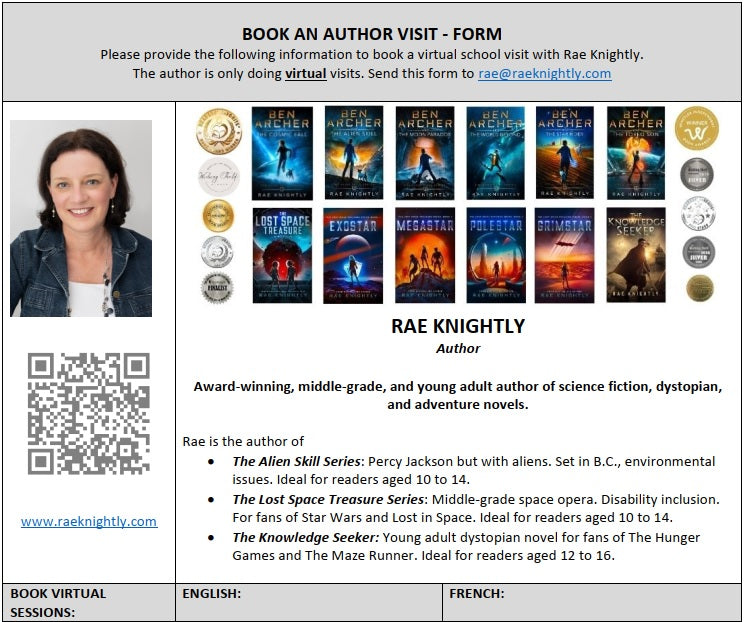 Book an author visit in English or French with Rae Knightly. Download and fill in the form below and email it to rae@raeknightly.com.